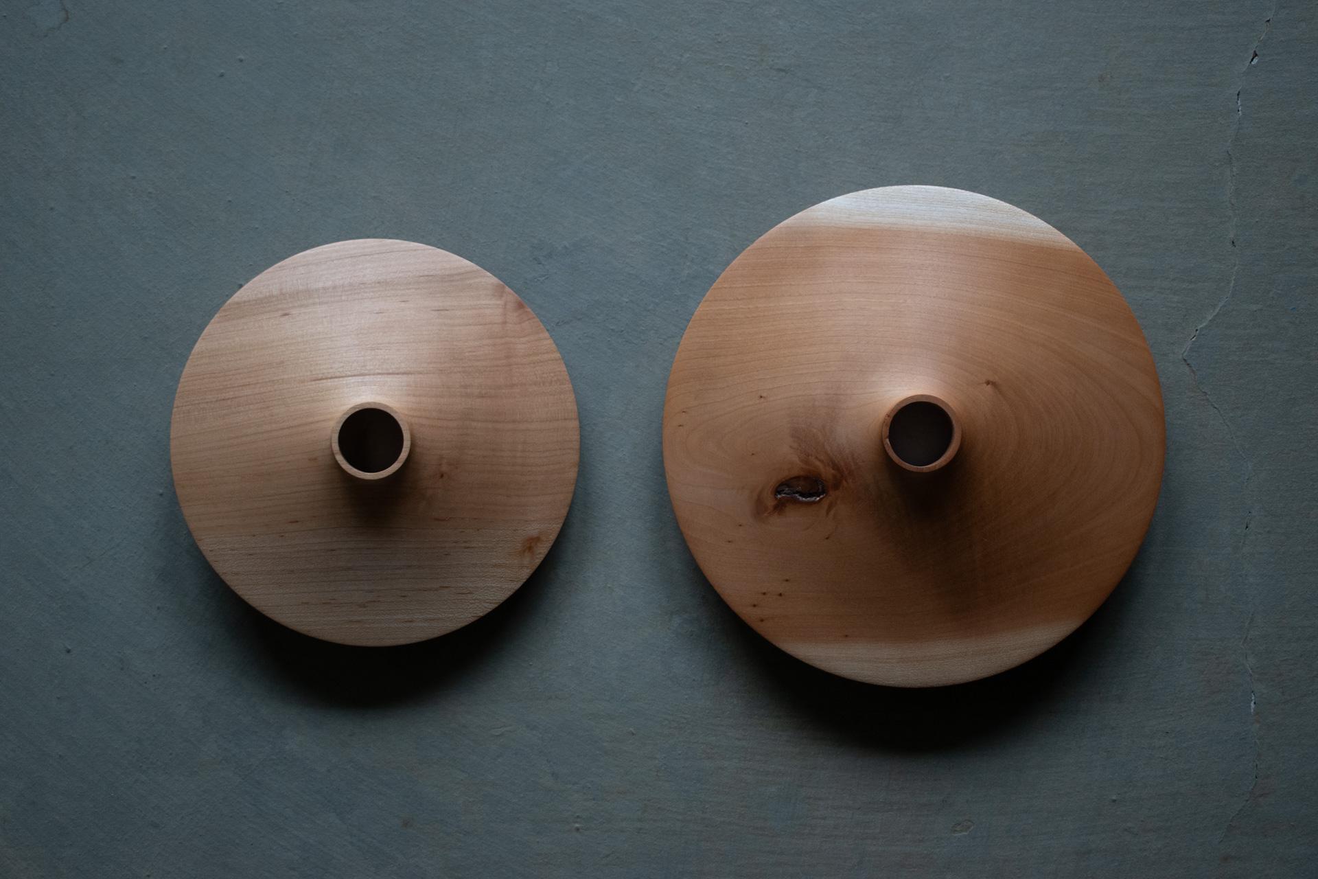 ロクロは一般的な刃物が回転する木工機械と大きく異なり刃物を自分の手で持ちます。自由度の高い加工をする事ができるのですが、そのぶん熟練した技術と感覚が無ければ型やガイドも無く同じ形に加工することは出来ません。